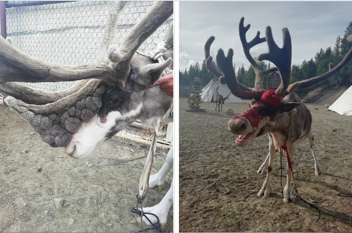 Ветеринарные специалисты региональной государственной ветеринарной службы на базе отдыха «Огни Имандры» провели в полевых условиях операцию по удалению патологического разрастания рога у северного оленя по кличке Бурка.