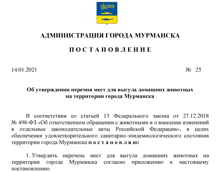 Постановление администрации города Мурманск от 14.01.2021 №25 «Об утверждении перечня мест для выгула домашних животных на территории города Мурманска»