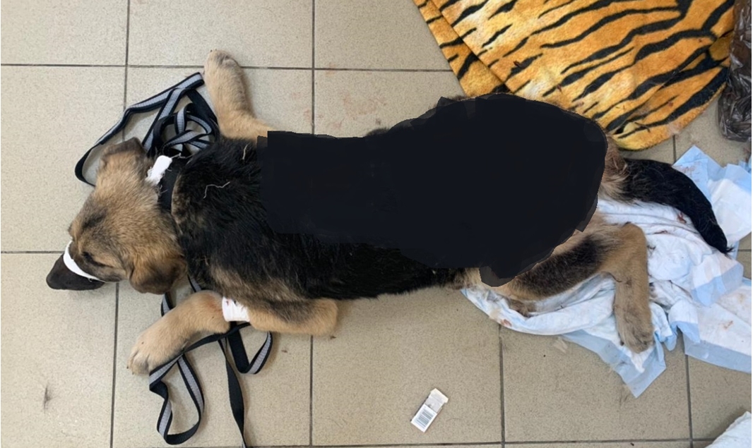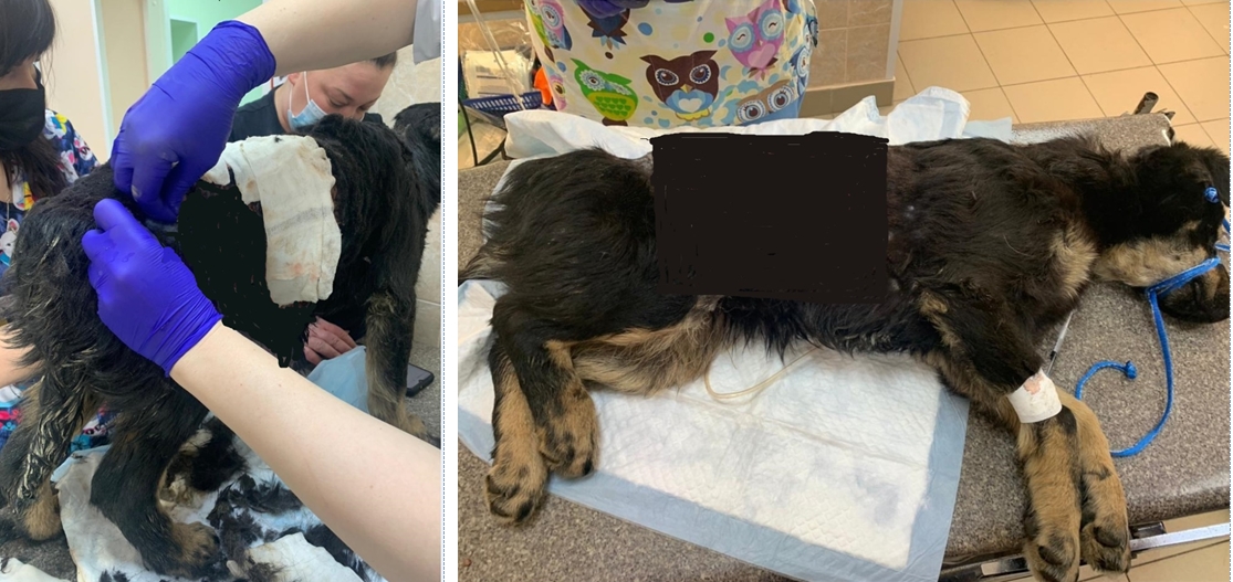 2. Щенок Матильда температура тела 38,6 0 С, в области холки отсутствует пласт кожи около 15 см., область поясницы рана от внутренней поверхности левого бедра до внутренней поверхности правого бедра около 35 см в длину, в области бедер глубокие колотые раны шириной 2,5-3 см.